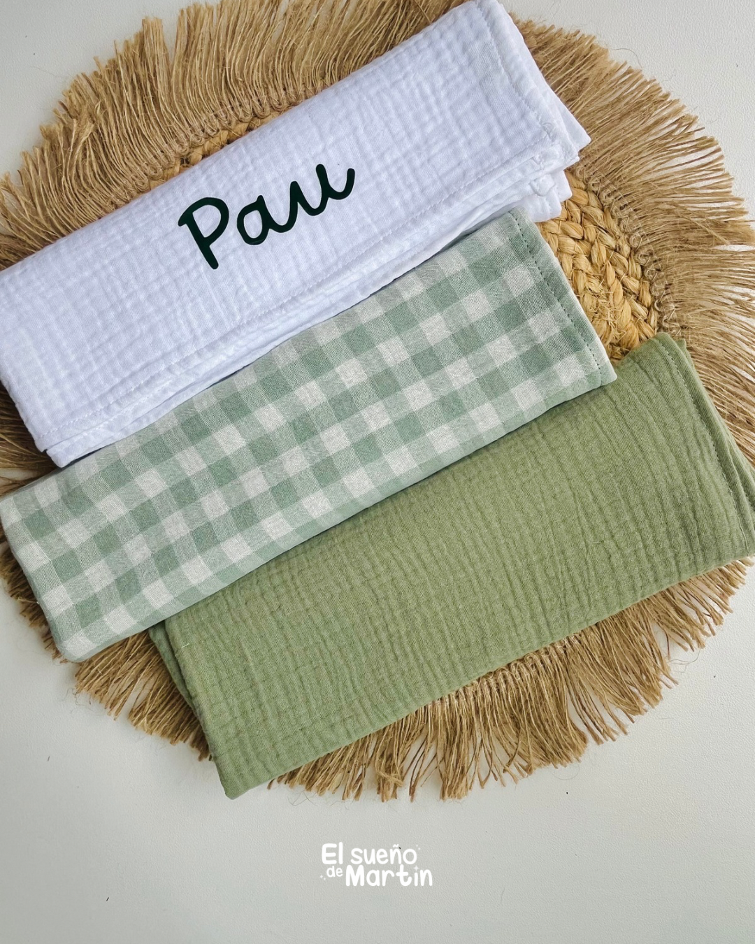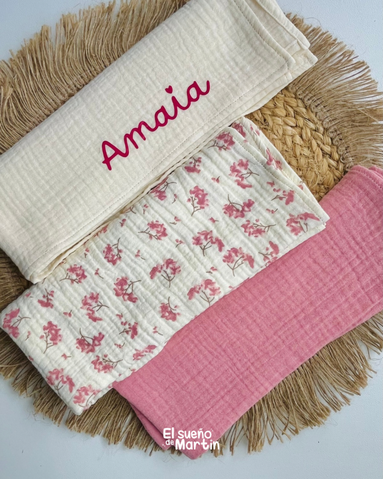 Nuestro pack es único porque cada pieza está creada de manera artesanal, con mimo y atención en cada detalle. No trabajamos con diseños genéricos: personalizamos cada muselina con el nombre del bebé, eligiendo tejidos suaves, transpirables y de máxima calidad.